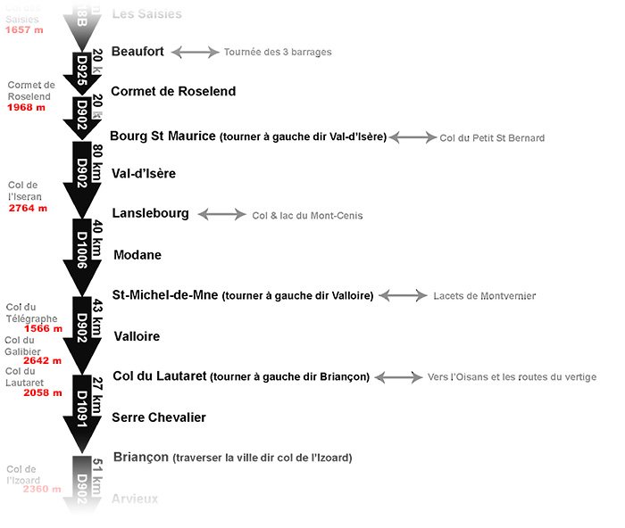 Attention : Les itinéraires générés peuvent être modifiés en fonction des conditions de circulation. Vérifiez qu'ils ne varient par trop par rapport à la carte. En cas de fermeture des cols, vous pouvez avoir le message "aucun itinéraire trouvé". Chaque étape est un point d'intérêt. Pensez à télécharger la carte au départ du guidage car il n'y a pas toujours suffisament de réseau sur la route.